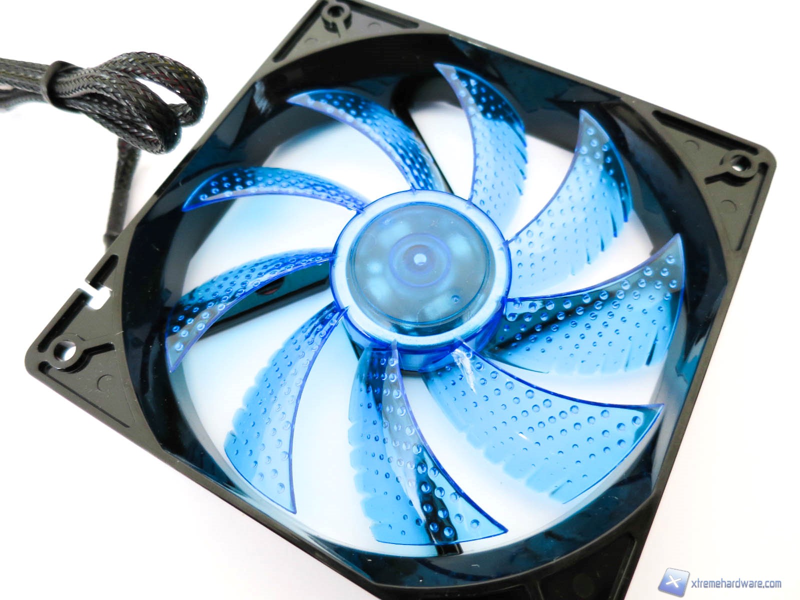 Analizzando nel dettaglio la ventola Coolmove 2 troviamo innanzitutto un design non classico che si caratterizza per una struttura/frame di colore nero che contrasta con le pale di colore azzurro e trasparenti. Le ventole hanno dimensioni standard di 120 x 120 x 25 millimetri di spessore. Siamo sicuri che il vostro occhio si sarà subito focalizzato sulle pale di queste ventole che presentano una struttura non classica. Troviamo 9 pale ed agli estremi di ognuna di esse sono presenti 5 fenditure realizzate per fendere l’aria mantenendo costante la rotazione e massimizzando il flusso. Inoltre notiamo anche dei piccoli rilievi circolari che servono come sempre per una questione aerodinamica, correlata al flusso generato. Le ventole sono dotate di un connettore a 3 pin con relativo cavo rivestito in treccia di tessuto di buona qualità e potranno quindi essere regolate in base alle proprie esigenze tramite un fan controller. Alphacool dichiara per le Coolmove 2 come dati tecnici una rotazione massima di 1300 RPM che garantisce valori di 58,6CFM con una rumorosità di 23 dBA. Prestazioni che le rendono adeguate alla struttura lamellare dell’Eisberg.